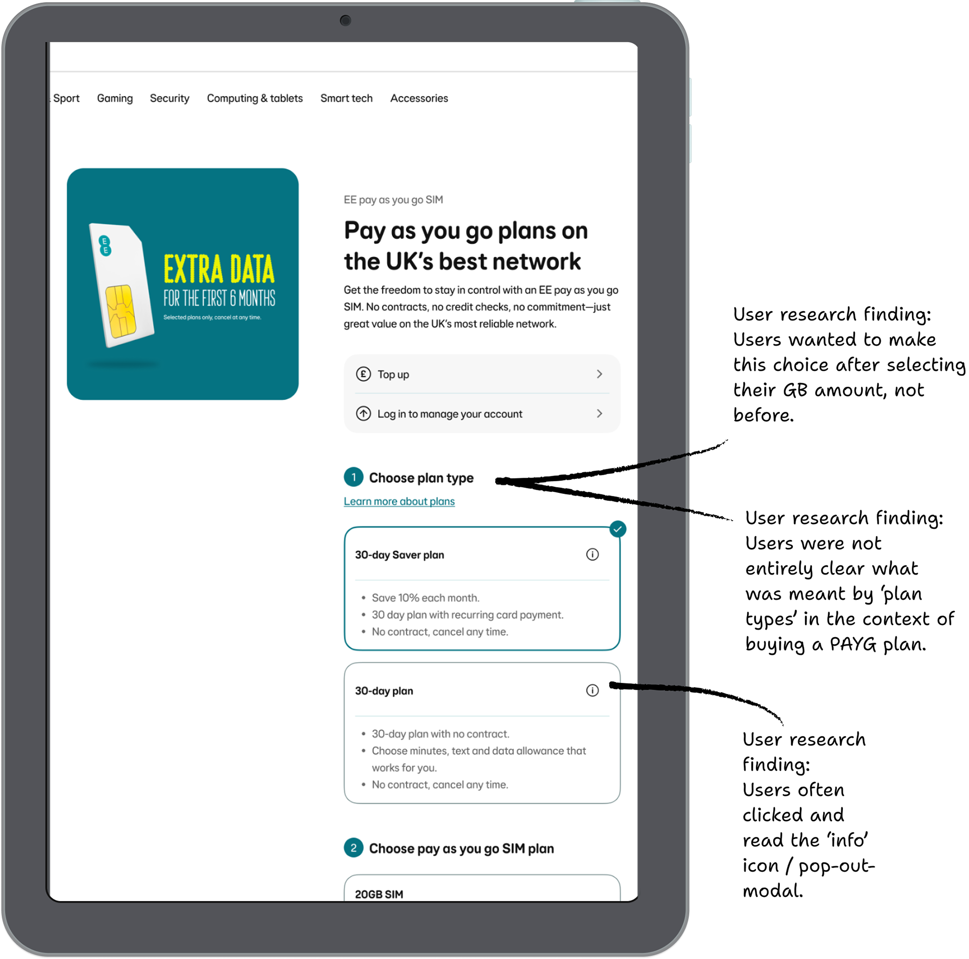 Why Following page updates, EE's product page for Pay as you Go SIM plans dropped drastically. I was asked to fix part of the problem by improving the page design. Following our iterative designs, continuous user testing and A/B testing, we doubled conversion and improved the channel share by 4%.